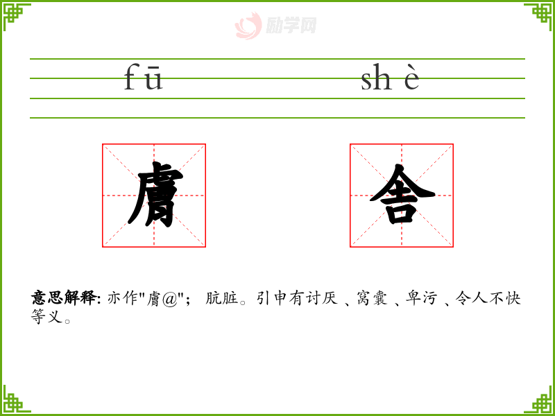 膚舎的意思是:亦作"膚@"; 肮脏。引申有讨厌﹑窝囊﹑卑污﹑令人不快等义。