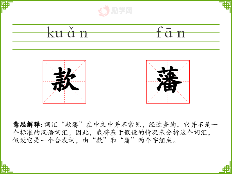 词汇“款藩”在中文中并不常见,经过查询,它并不是一个标准的汉语词汇。因此,我将基于假设的情况来分析这个词汇,假设它是一个合成词,由“款”和“藩”两个字组成。