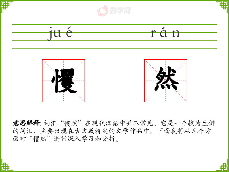 词汇“戄然”在现代汉语中并不常见,它是一个较为生僻的词汇,主要出现在古文或特定的文学作品中。下面我将从几个方面对“戄然”进行深入学*和分析。