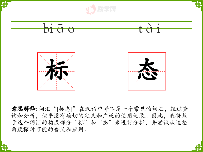 词汇“[标态]”在汉语中并不是一个常见的词汇,经过查询和分析,似乎没有确切的定义和广泛的使用记录。因此,我将基于这个词汇的构成部分“标”和“态”来进行分析,并尝试从这些角度探讨可能的含义和应用。