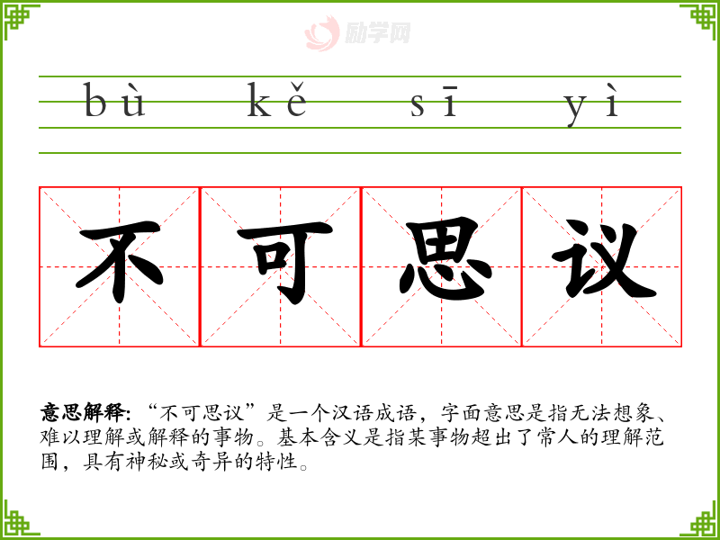 “不可思议”是一个汉语成语,字面意思是指无法想象、难以理解或解释的事物。基本含义是指某事物超出了常人的理解范围,具有神秘或奇异的特性。
