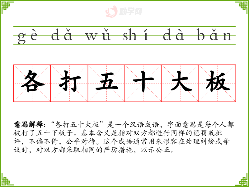 各打五十大板的意思是:各:各自。给双方同样的待遇或不分清责任,让双方共同承担责任。