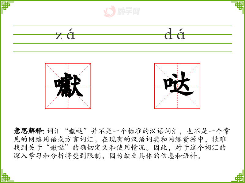 词汇“囐哒”并不是一个标准的汉语词汇,也不是一个常见的网络用语或方言词汇。在现有的汉语词典和网络资源中,很难找到关于“囐哒”的确切定义和使用情况。因此,对于这个词汇的深入学*和分析将受到限制,因为缺乏具体的信息和语料。