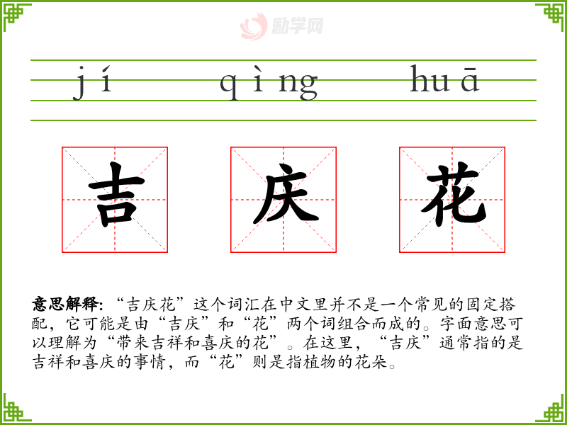 “吉庆花”这个词汇虽然不是一个常见的固定词汇,但它体现了人们对美好生活的向往和对吉祥喜庆的追求。在学*语言和表达时,了解和掌握这样的词汇可以帮助我们更好地理解和融入特定的文化语境。