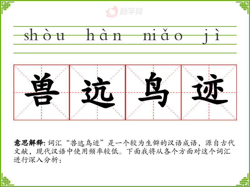 词汇“兽迒鸟迹”是一个较为生僻的汉语成语,源自古代文献,现代汉语中使用频率较低。下面我将从各个方面对这个词汇进行深入分析: