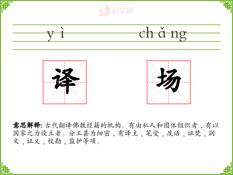 译场的意思是:古代翻译佛教经籍的机构。有由私人和团体组织者﹐有以国家之力设立者。分工甚为细密﹐有译主﹑笔受﹑度语﹑证梵﹑润文﹑证义﹑校勘﹑监护等项。