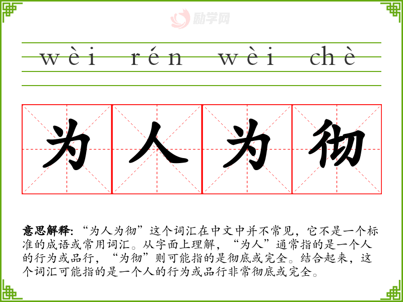 在特定的文化或社会背景中,如果有人使用“为人为彻”这个词汇,它可能被用来强调一个人的行为或品行的完美性。这种表达可能出现在对个人品德高度评价的场合。