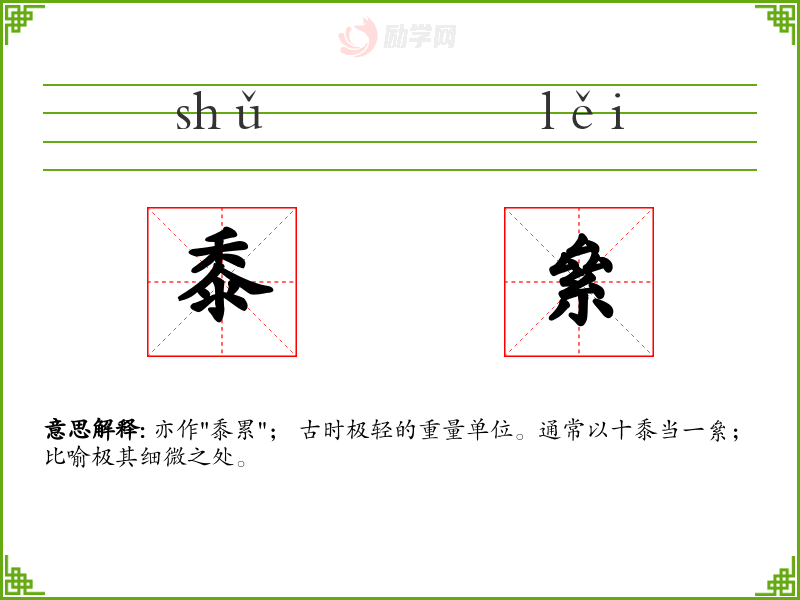 黍絫的意思是:亦作"黍累"; 古时极轻的重量单位。通常以十黍当一絫; 比喻极其细微之处。