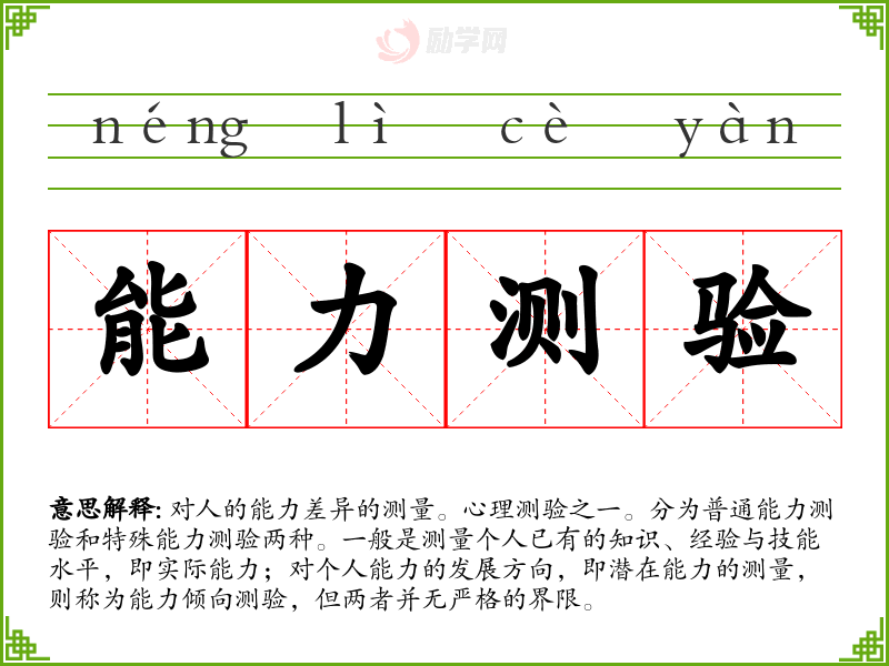 能力测验的意思是:对人的能力差异的测量。心理测验之一。分为普通能力测验和特殊能力测验两种。一般是测量个人已有的知识、经验与技能水平,即实际能力;对个人能力的发展方向,即潜在能力的测量,则称为能力倾向测验,但两者并无严格的界限。