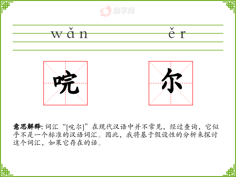 综上所述,词汇“[唍尔]”在现代汉语中并不存在,因此无法进行深入的学习和分析。如果这是一个特定领域或文化中的术语,可能需要更多的上下文信息来进行分析。