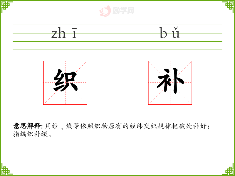 织补的意思是:用纱﹑线等依照织物原有的经纬交织规律把破处补好; 指编织补缀。