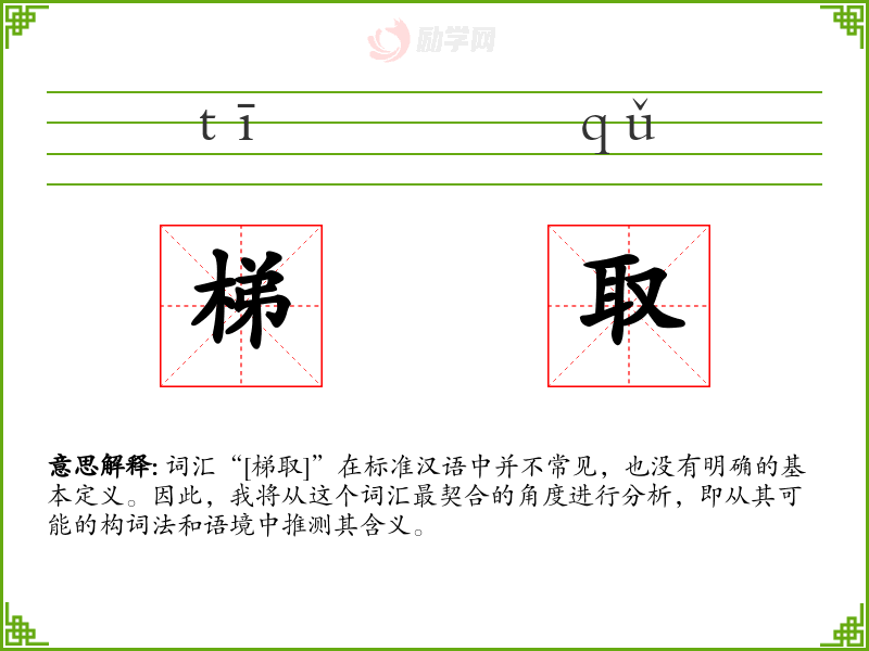 总的来说,“[梯取]”不是一个标准汉语词汇,其含义和使用需要具体的上下文来确定。在语言学习和表达中,了解词汇的准确含义和用法是非常重要的,而“[梯取]”这样的词汇则需要更多的信息和上下文来理解。