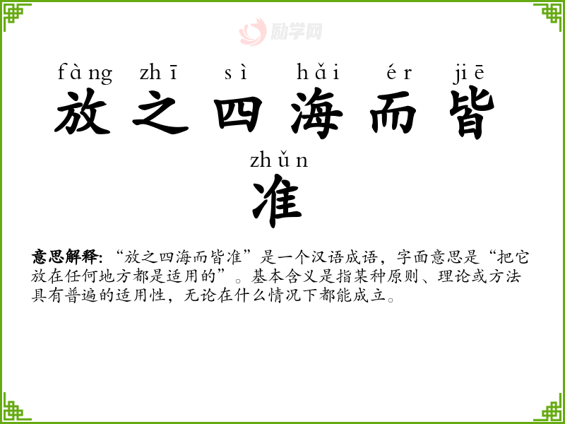 放之四海而皆准的意思是:四海:古人认为中国四境有海环绕,故称全国为“四海”;准:准确。比喻具有普遍性的真理到处都适用。