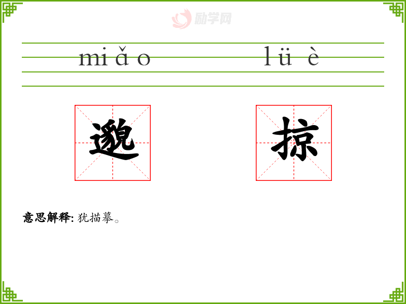 邈[ miǎo ] 1. (形声。从辵(chuò),貌声。本义:距离遥远)。 2. 同本义,通“藐”。 【引证】 陆机《谢平原内史表》-振景拔迹,顾邈同列。 吴均《与朱元思书》-互相轩邈。 【组词】 邈若山河、 邈绵、 邈廓、 邈远、 邈然 [更多解释]