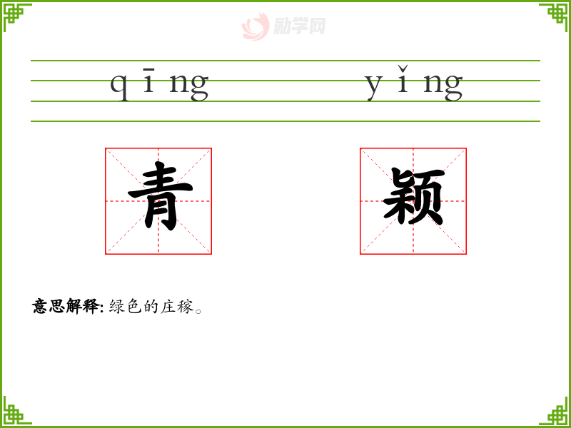 《说文》-颖,禾末也。从禾,顷声。谓贯于穗及近于穗之芒秒。 《小尔雅》-禾穗谓之颖。 《书·归禾序》-异亩同颖。 《诗·大雅·生民》-实颖实贾。 应贞《晋武帝华林园林》-嘉禾重颖。