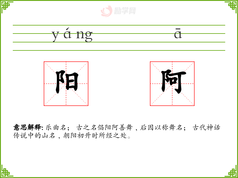 《说文》-阳,高明也。 《谷梁传·僖公二十八年》-山南为阳,水北为阳。 《尔雅》-山东曰朝阳,山西曰夕阳。 《周礼·柞氏》。注:“生于山南为阳木。”-利刊阳木而火之。 《列子·汤问》-河阳之北。 宋·王安石《游褒禅山记》-华山之阳。 清·姚鼐《登泰山记》-阳谷皆入汶。