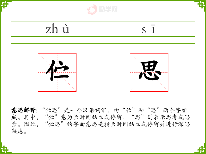“伫思”是一个汉语词汇,由“伫”和“思”两个字组成。其中,“伫”意为长时间站立或停留,“思”则表示思考或思索。因此,“伫思”的字面意思是指长时间站立或停留并进行深思熟虑。