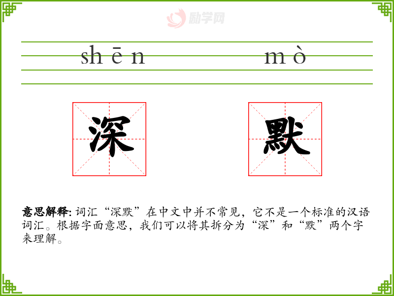 词汇“深默”在中文中并不常见,它不是一个标准的汉语词汇。根据字面意思,我们可以将其拆分为“深”和“默”两个字来理解。