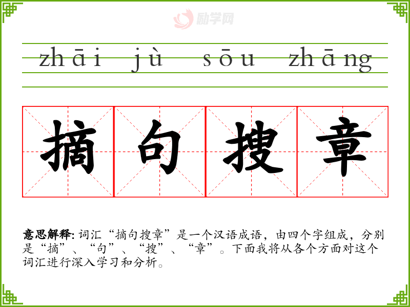 词汇“摘句搜章”是一个汉语成语,由四个字组成,分别是“摘”、“句”、“搜”、“章”。下面我将从各个方面对这个词汇进行深入学*和分析。