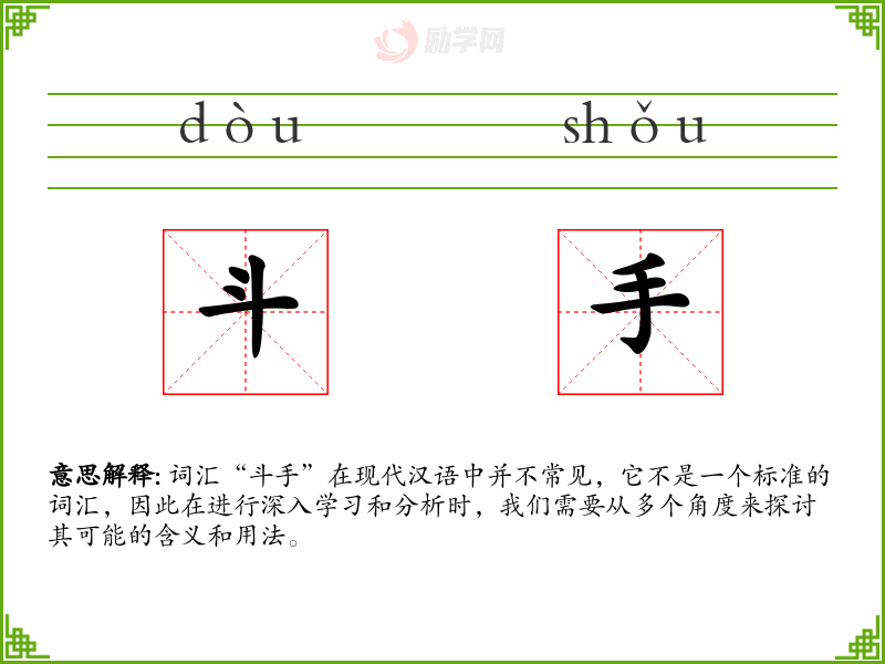 词汇“斗手”在现代汉语中并不常见,它不是一个标准的词汇,因此在进行深入学习和分析时,我们需要从多个角度来探讨其可能的含义和用法。