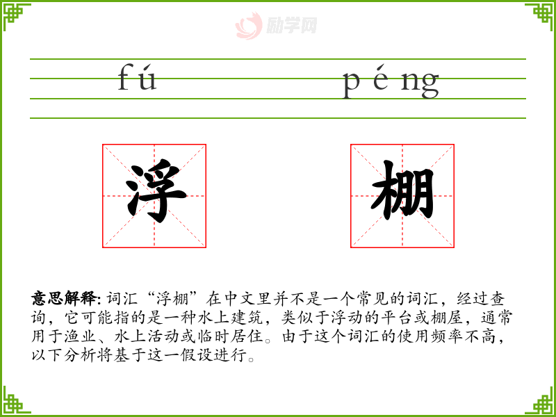 词汇“浮棚”在中文里并不是一个常见的词汇,经过查询,它可能指的是一种水上建筑,类似于浮动的平台或棚屋,通常用于渔业、水上活动或临时居住。由于这个词汇的使用频率不高,以下分析将基于这一假设进行。