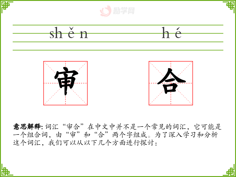 词汇“审合”在中文中并不是一个常见的词汇,它可能是一个组合词,由“审”和“合”两个字组成。为了深入学习和分析这个词汇,我们可以从以下几个方面进行探讨: