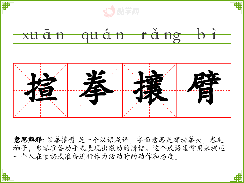 揎拳攘臂 这个成语在描述激动和准备行动时非常生动和有力。它在文学和口语中都有广泛的应用,能够有效地传达角色的情绪和状态。在我的语言学*和表达中,理解和正确使用这个成语可以增强我的表达能力和语言的丰富性。