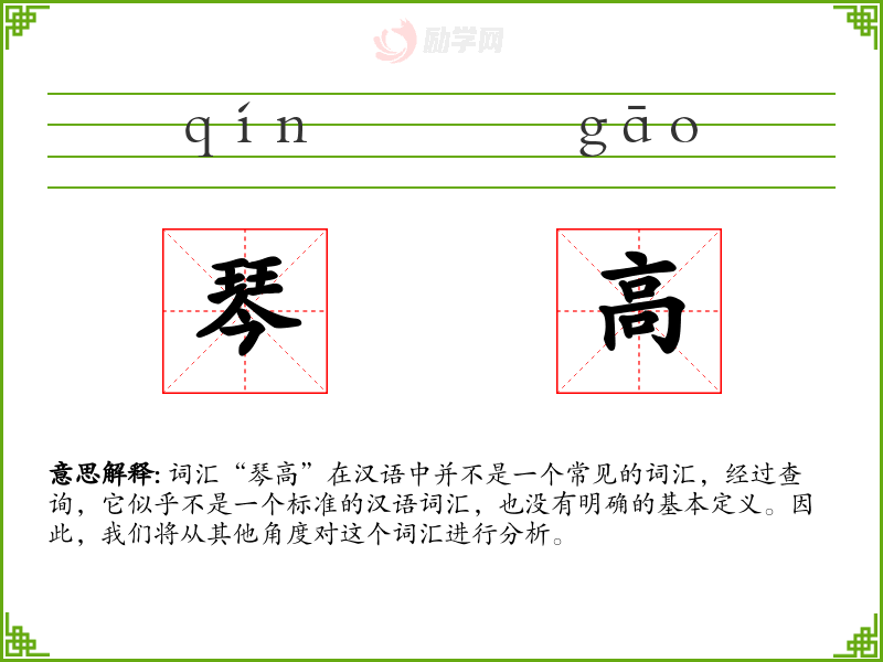 由于“琴高”不是一个标准的汉语词汇,我们无法提供一个确切的基本定义。它可能是由两个字“琴”和“高”组合而成的,但这种组合在汉语中并没有特定的含义。