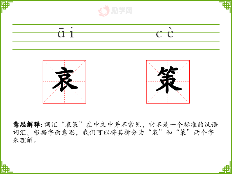 词汇“哀策”在中文中并不常见,它不是一个标准的汉语词汇。根据字面意思,我们可以将其拆分为“哀”和“策”两个字来理解。