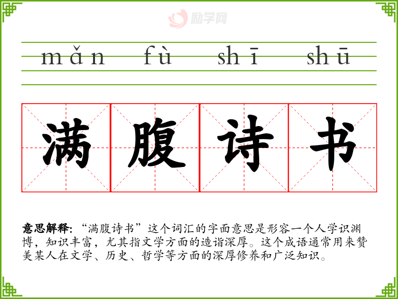 “满腹诗书”这个词汇的字面意思是形容一个人学识渊博,知识丰富,尤其指文学方面的造诣深厚。这个成语通常用来赞美某人在文学、历史、哲学等方面的深厚修养和广泛知识。