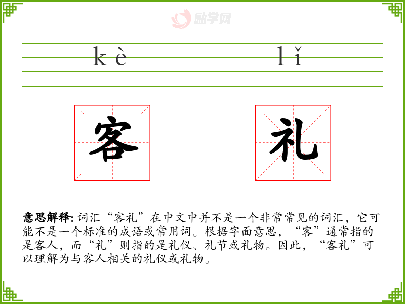 词汇“客礼”在中文中并不是一个非常常见的词汇,它可能不是一个标准的成语或常用词。根据字面意思,“客”通常指的是客人,而“礼”则指的是礼仪、礼节或礼物。因此,“客礼”可以理解为与客人相关的礼仪或礼物。