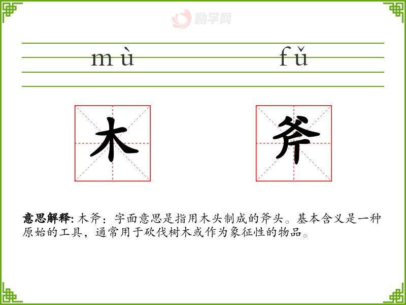 木斧:字面意思是指用木头制成的斧头。基本含义是一种原始的工具,通常用于砍伐树木或作为象征性的物品。