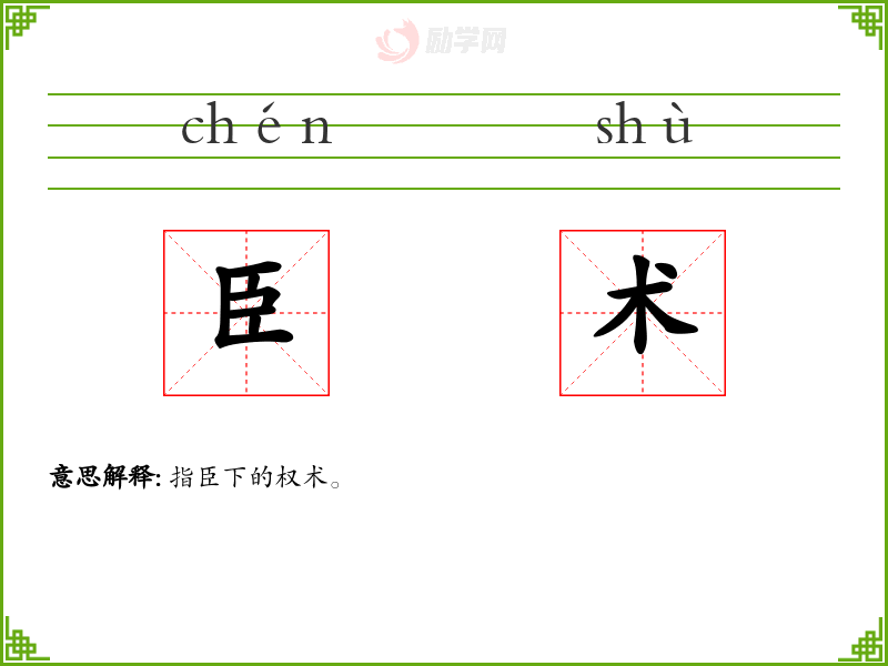 《说文》-臣,事君者也。象屈服之形。 《礼记·礼运》-仕于公曰臣。 《国语·晋语》-事君不贰是谓臣。 《左传·成公二年》-臣治烦去惑者也。 《书·费誓》。郑注:“臣妾,厮役之属也。”-臣妾逋逃。 《礼记·少仪》。注:“谓囚俘。”-臣则左之。 《韩非子·五蠹》-虽臣虏之劳不苦于此矣。