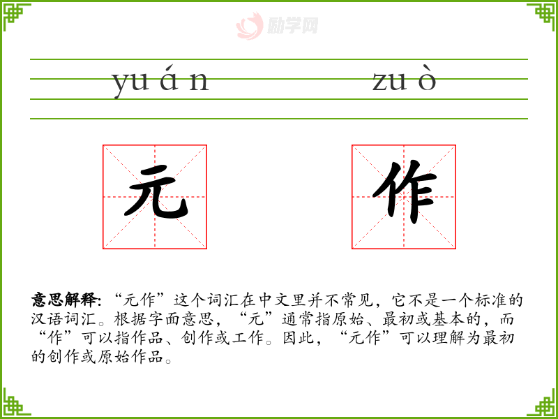 “元作”这个词汇在中文里并不常见,它不是一个标准的汉语词汇。根据字面意思,“元”通常指原始、最初或基本的,而“作”可以指作品、创作或工作。因此,“元作”可以理解为最初的创作或原始作品。