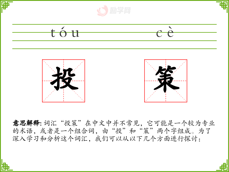词汇“投策”在中文中并不常见,它可能是一个较为专业的术语,或者是一个组合词,由“投”和“策”两个字组成。为了深入学习和分析这个词汇,我们可以从以下几个方面进行探讨: