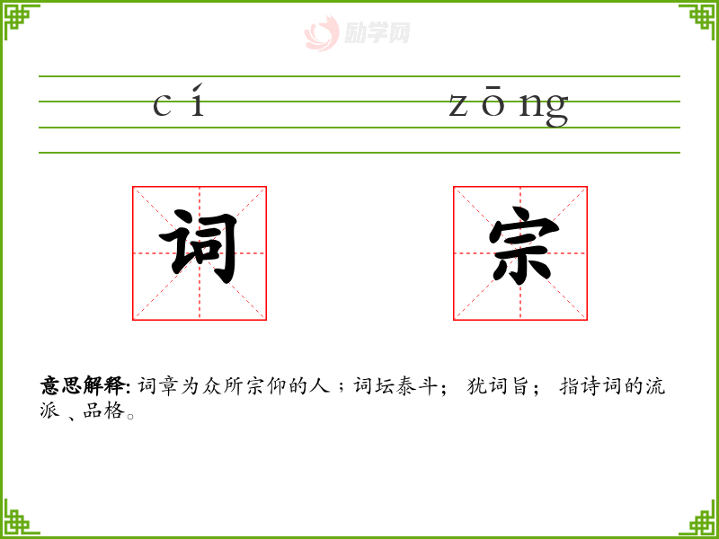 词宗的意思是:词章为众所宗仰的人﹔词坛泰斗; 犹词旨; 指诗词的流派﹑品格。