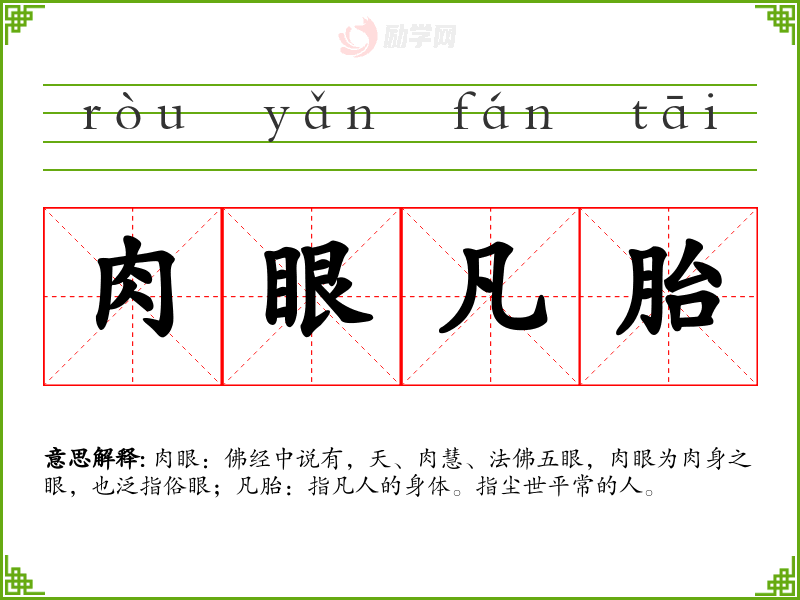 肉眼:佛经中说有,天、肉慧、法佛五眼,肉眼为肉身之眼,也泛指俗眼;凡胎:指凡人的身体。指尘世平常的人。