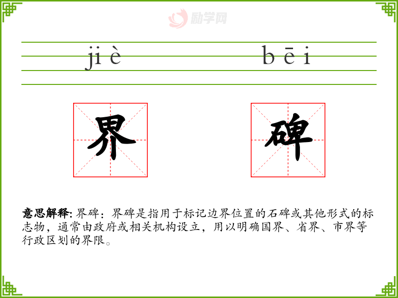 界碑的意思是:在交界的地方树立的碑,用做分界的标志。