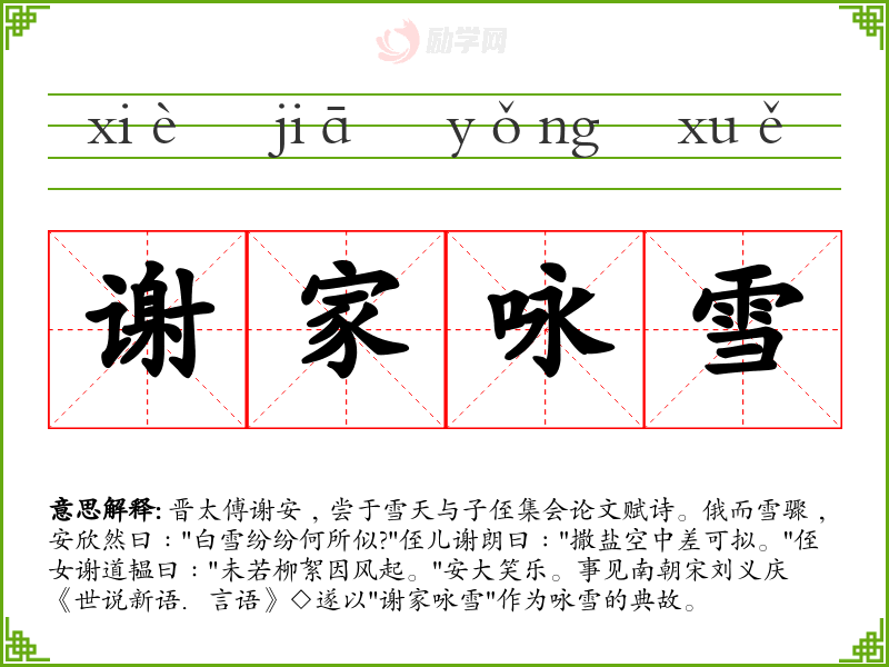 晋太傅谢安﹐尝于雪天与子侄集会论文赋诗。俄而雪骤﹐安欣然曰﹕"白雪纷纷何所似?"侄儿谢朗曰﹕"撒盐空中差可拟。"侄女谢道韫曰﹕"未若柳絮因风起。"安大笑乐。事见南朝宋刘义庆《世说新语.言语》◇遂以"谢家咏雪"作为咏雪的典故。