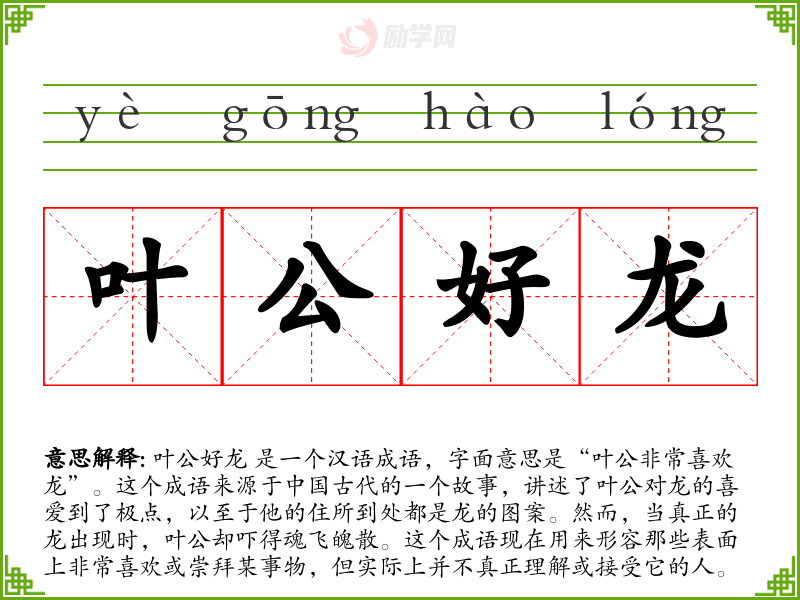 叶公好龙 是一个汉语成语,字面意思是“叶公非常喜欢龙”。这个成语来源于**古代的一个故事,讲述了叶公对龙的喜爱到了极点,以至于他的住所到处都是龙的图案。然而,当真正的龙出现时,叶公却吓得魂飞魄散。这个成语现在用来形容那些表面上非常喜欢或崇拜某事物,但实际上并不真正理解或接受它的人。