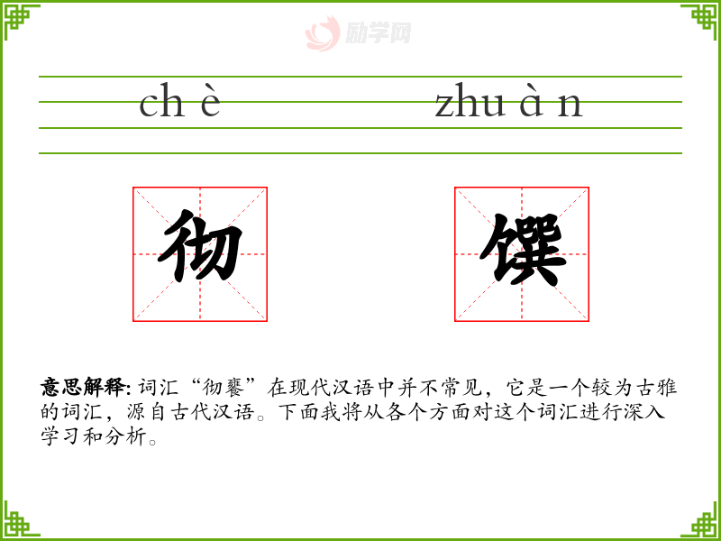 “彻饔”是一个具有深厚历史文化背景的词汇,虽然在现代汉语中不再常用,但了解它有助于我们更好地理解古代文化和语言的演变。在学*古代文学或文化时,这个词汇可以作为一个重要的参考点。