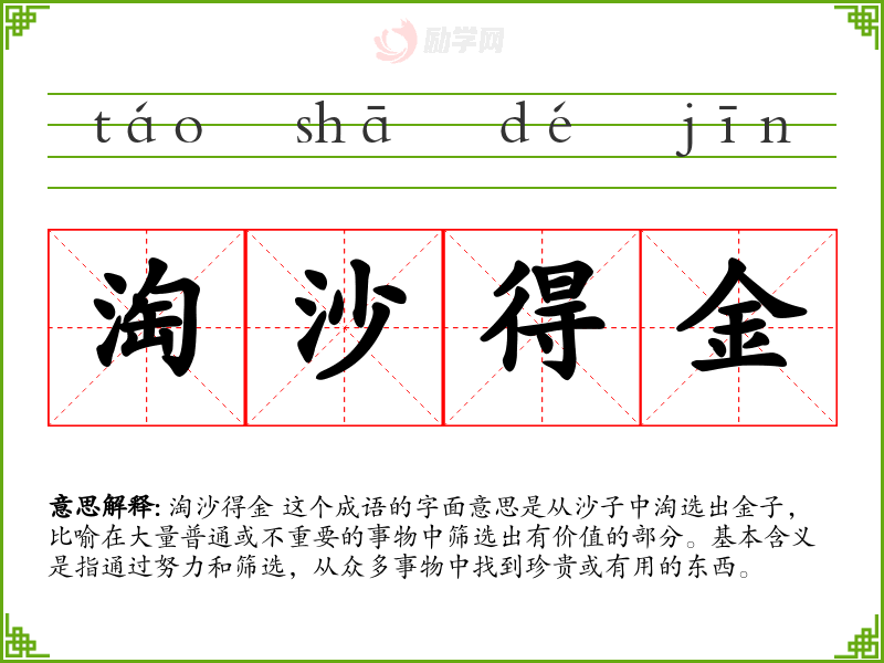 淘沙得金 这个成语的字面意思是从沙子中淘选出金子,比喻在大量普通或不重要的事物中筛选出有价值的部分。基本含义是指通过努力和筛选,从众多事物中找到珍贵或有用的东西。