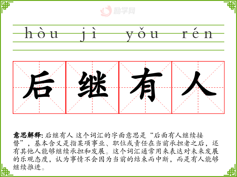 后继有人 这个词汇的字面意思是“后面有人继续接替”,基本含义是指某项事业、职位或责任在当前承担者之后,还有其他人能够继续承担和发展。这个词汇通常用来表达对未来发展的乐观态度,认为事情不会因为当前的结束而中断,而是有人能够继续推进。
