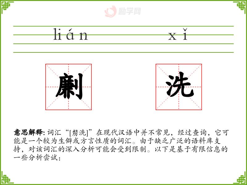 词汇“[剺洗]”在现代汉语中并不常见,经过查询,它可能是一个较为生僻或方言性质的词汇。由于缺乏广泛的语料库支持,对该词汇的深入分析可能会受到限制。以下是基于有限信息的一些分析尝试: