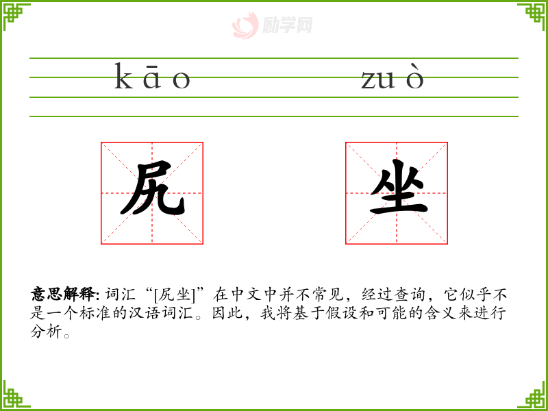 词汇“[尻坐]”在中文中并不常见,经过查询,它似乎不是一个标准的汉语词汇。因此,我将基于假设和可能的含义来进行分析。