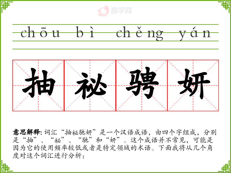 - 词源:这个成语的词源不太明确,可能是由“抽”(提取)、“祕”(秘密)、“驰”(展现)和“妍”(美丽)四个字组合而成。