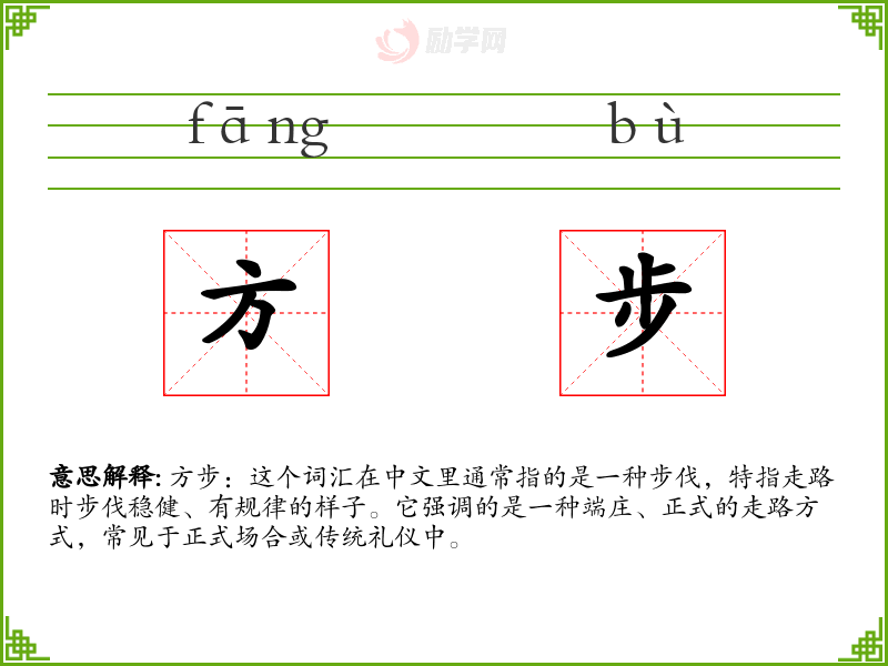 - 口语:在日常口语中,方步可能带有一定的戏谑意味,如“你走路像在走方步,太正式了吧!”