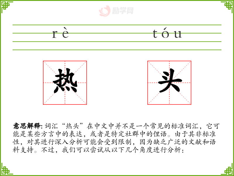 词汇“热头”在中文中并不是一个常见的标准词汇,它可能是某些方言中的表达,或者是特定社群中的俚语。由于其非标准性,对其进行深入分析可能会受到限制,因为缺乏广泛的文献和语料支持。不过,我们可以尝试从以下几个角度进行分析: