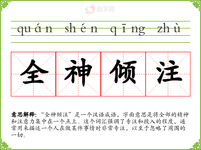 “全神倾注”是一个汉语成语,字面意思是将全部的精神和注意力集中在一个点上。这个词汇强调了专注和投入的程度,通常用来描述一个人在做某件事情时非常专注,以至于忽略了周围的一切。