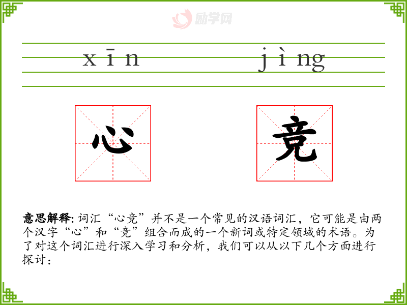 词汇“心竞”并不是一个常见的汉语词汇,它可能是由两个汉字“心”和“竞”组合而成的一个新词或特定领域的术语。为了对这个词汇进行深入学习和分析,我们可以从以下几个方面进行探讨: